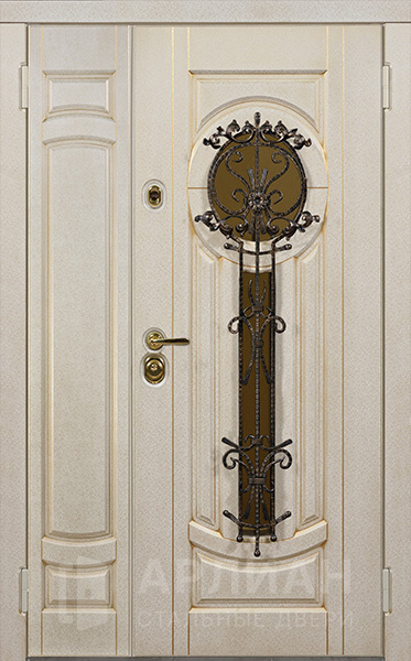 Металлическая двустворчатая дверь со стеклом и кованой решеткой №15