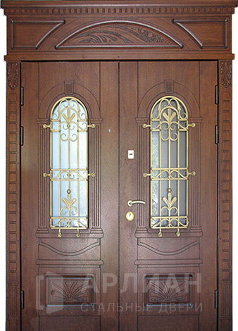 Двухстворчатая входная дверь со стеклом и ковкой №9